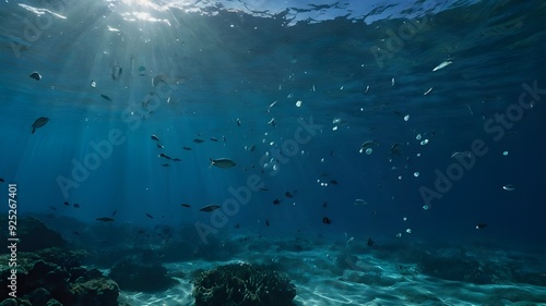 © Khawla, Fototapeta premium Underwater Sea Scene of coral reef, Sunlight shining undersea background
