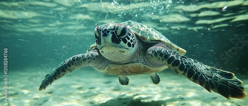 © ATVPEDIA ID, Fototapeta premium Underwater sea turtle gracefully swims, its shell patterned beautifully against a light sandy seabed. Bubbles rise gently around it