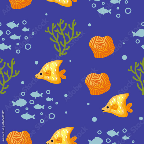 © Fui, Naklejka premium Underwater Seamless Pattern Featuring Yellow Fish Coral Reef and Blue Background Ocean Themed Design with Marine Life Illustrations Suitable for Fabric