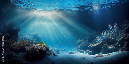 Obraz premium Underwater seascape - rays of light, fish and coral reef. Generative AI