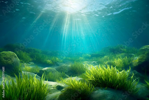 Obraz premium Underwater seascape with green aquatic algae on the ocean floor with natural sunlight.