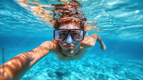 Fototapeta premium Underwater selfie, snorkeling man, turquoise ocean, sunny beach background, travel