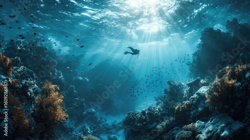 © dsant, Fototapeta premium Underwater Serenity: A Diver Explores Vibrant Coral Reef