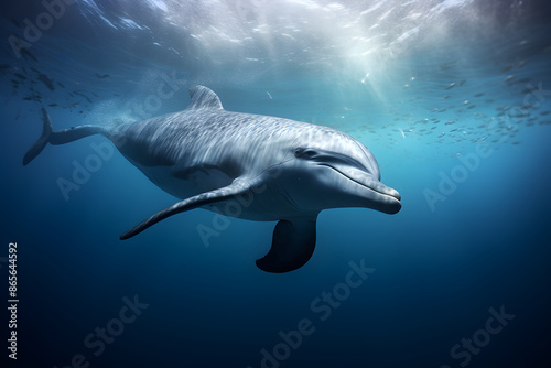© New Robot, Naklejka premium Underwater Serenity: Capturing the Majestic and Graceful Movement of a Dolphin in its Natural Habitat