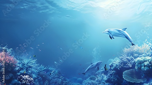 Fototapeta premium Underwater Serenity:Peaceful Dolphins,Vibrant Coral Reefs,and Schools of Tropical Fish in a Captivating Blue Backdrop,Showcasing the Wonders of the Marine Ecosystem.