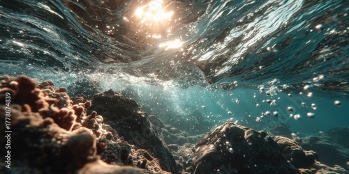 Fototapeta premium Underwater Serenity with Sunlight and Coral in Clear Ocean Water