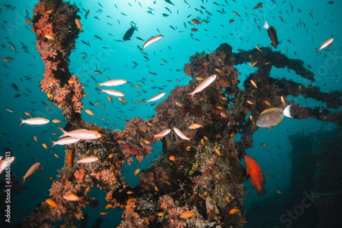 © Aaron, Fototapeta premium Underwater ship wreck surrounded by small tropical fish in blue ocean