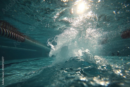 Obraz premium Underwater shot capturing the dynamic motion and splashes in a swimming pool, creating a sense of depth and movement with sunlight filtering through the water surface.
