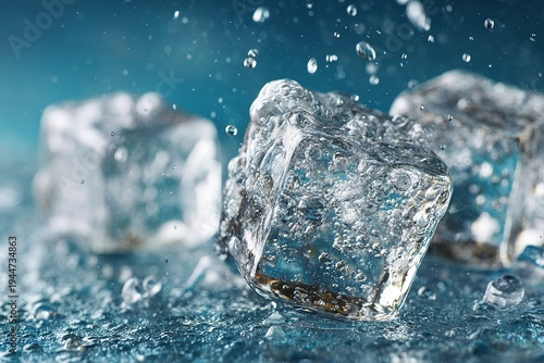 © Vasiliy, Obraz premium Underwater shot of crystal clear ice cubes falling into blue water