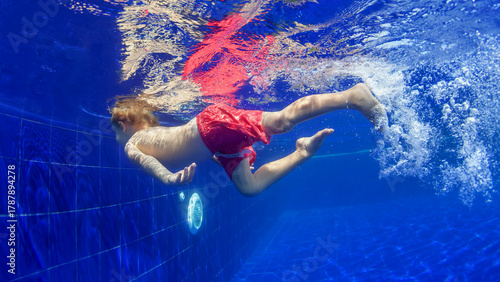 © Tropical studio, Naklejka premium Underwater shot of happy smiling young child jumping with splashes and diving with fun in blue swimming pool. Healthy family lifestyle, water sport activity, swimming lessons on holidays with kids