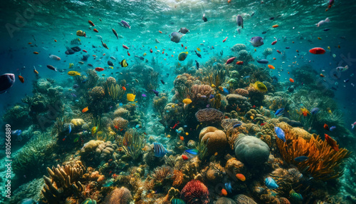 Fototapeta premium Underwater snorkeling scene with coral reefs and colorful fish in the Caribbean., generative ai