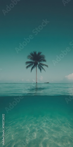 Fototapeta premium Underwater split shot reveals a solitary palm tree standing on a tranquil...