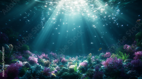 Fototapeta premium Underwater Sunbeams and Ocean Floor with Colorful Coral