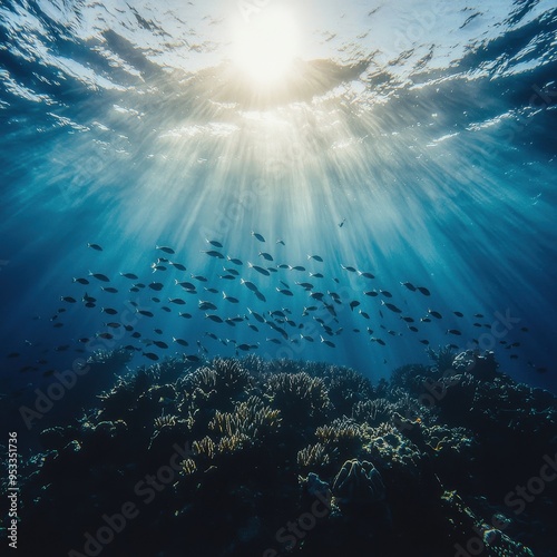 Obraz premium Underwater Sunlight Beams Through Blue Ocean Water With Fish and Coral Reef