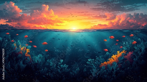 Fototapeta premium Underwater Sunset with Coral Reef and Fish