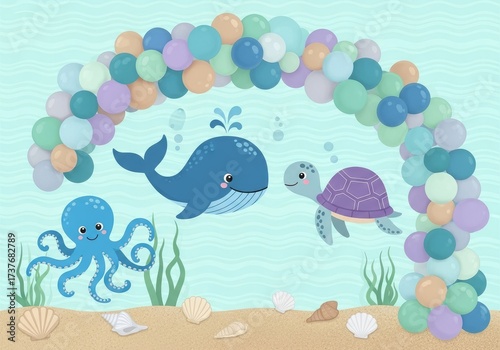Naklejka premium Underwater themed birthday party backdrop with balloons and marine animals