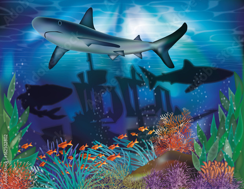 Fototapeta premium Underwater tropical background with Shark, vector illustration