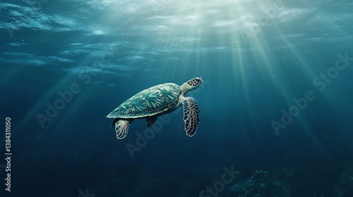 Obraz premium Underwater Turtle Sunbeams Ocean Depths