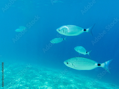 © VictoriaKurylo, Naklejka premium UNDERWATER view. Fishes in the turquoise clear water and white pebbles scattered off the seabed of the Antisamos bay, Kefalonia island, Ionian Sea, Greece. Natural background.