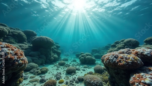 Fototapeta premium Underwater view of a coral reef with sunlight rays filtering through clear ocean