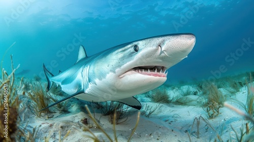 © Tina, Fototapeta premium Underwater view of a shark swimming over sandy ocean floor with sea grass in background