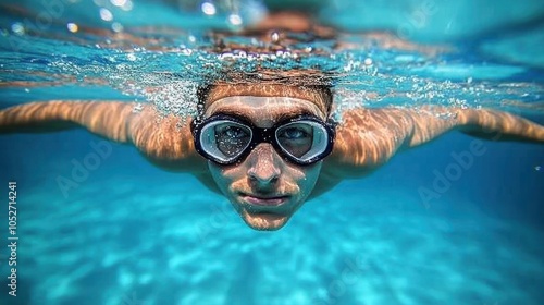 © Muamanah, Naklejka premium Underwater View of a Swimmer Wearing Goggles