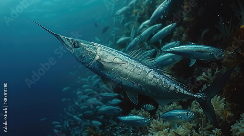 Fototapeta premium Underwater view of a swordfish hunting in a school of sardines