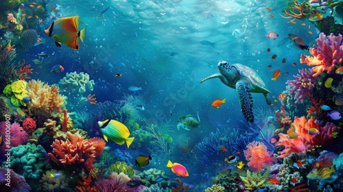 Fototapeta premium Underwater view of a vibrant coral reef with various marine creatures like fish, sea turtles, and corals