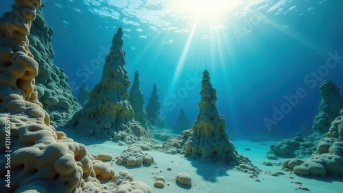Fototapeta premium Underwater view of bleached coral pillars on sandy ocean floor with sunlight filtering through