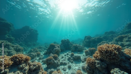 Naklejka premium Underwater view of bleached coral skeletons on the ocean floor with sunlight rays above