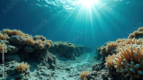 © Xavi, Obraz premium Underwater view of coral reef affected by bleaching with sunlight above
