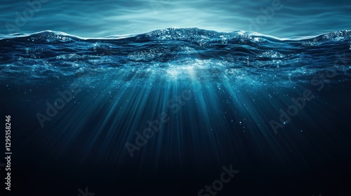 Fototapeta premium Underwater view of deep ocean, sunlight beams through surface.