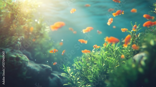 © Akstem, Fototapeta premium Underwater view of fish swimming among plants and algae in a sunny aquarium.