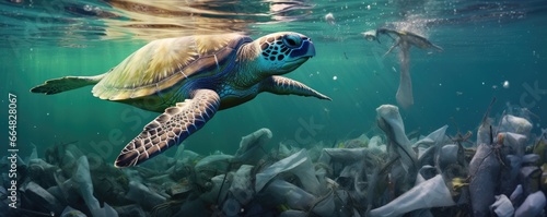 Fototapeta premium Underwater view of many plastic pollution in ocean water with swimming turtles, panorama. Generative Ai.