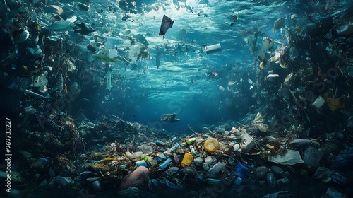 Fototapeta premium Underwater view of ocean pollution with plastic waste, showcasing the...