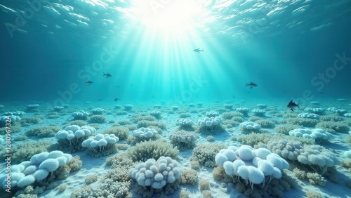 © Xavi, Naklejka premium Underwater view of sandy ocean floor with scattered rocks and sunlight rays