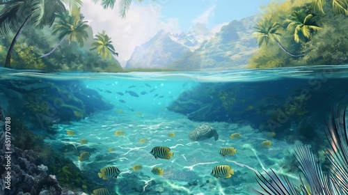 Fototapeta premium Underwater view of tropical lagoon with fish, palm trees, and mountains