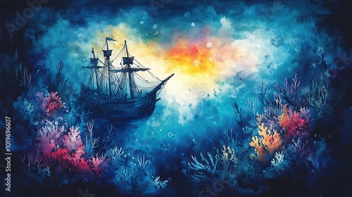 Fototapeta premium Underwater Watercolor Scene with Ship and Coral