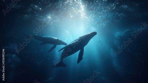 © S, Fototapeta premium Underwater whales swimming in sunlight