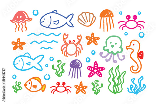 Naklejka premium Underwater Wonderland Sketch: A colorful and whimsical sketch of various aquatic creatures, each rendered in a vibrant palette of blues, oranges, and greens, creating a lively underwater scene.