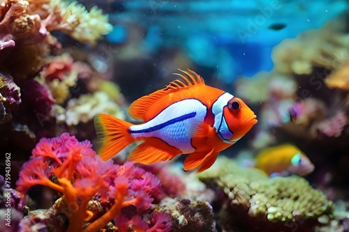Fototapeta premium Underwater world scenery with fish swimming among vibrant corals in tropical...