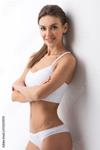 © yellowj, Naklejka premium underwear woman on white background in studio
