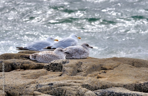 © aquaphoto, Obraz premium Une famille de Goelands attend sur un gros rocher