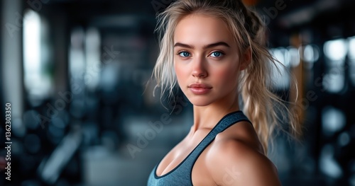 © David Giraud, Fototapeta premium Une femme blonde en tenue de sport, au corps athlétique et aux yeux bleus, posant devant l'objectif pendant un entraînement à la salle de sport.