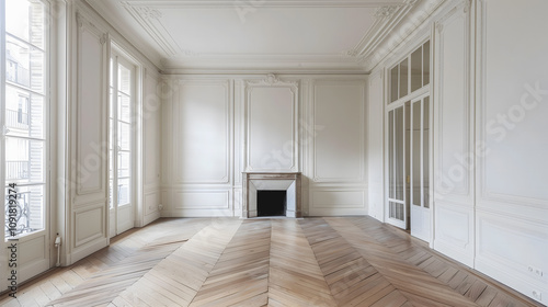 © Gautier Normand, Obraz premium Une pièce spacieuse et vide d'un appartement haussmannien.