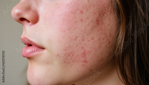 Obraz premium unedited real skin photo of woman with hormonal acne and facial redness, soft...