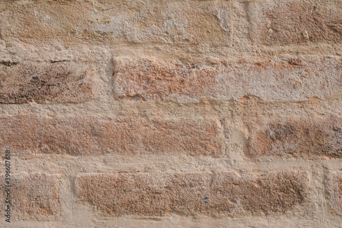 Fototapeta premium Uneven brick wall with cracked bricks, wall empty with space for text and a...