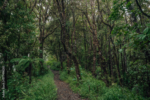 Obraz premium Unexplored path. Curvy road ahead. Jungle safari searing wild animals. Tall trees, glomy weather, mysterious nature