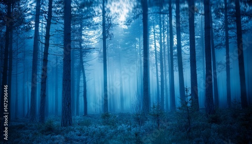 © Selene, Fototapeta premium unfocused blue twilight forest scary horror trees scenic environment