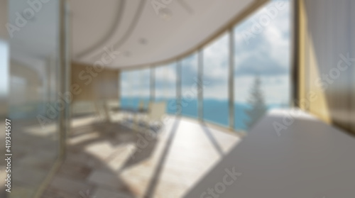 © COK House, Fototapeta premium Unfocused, Blur phototography. Open space office interior with like conference room. Mockup. 3D
